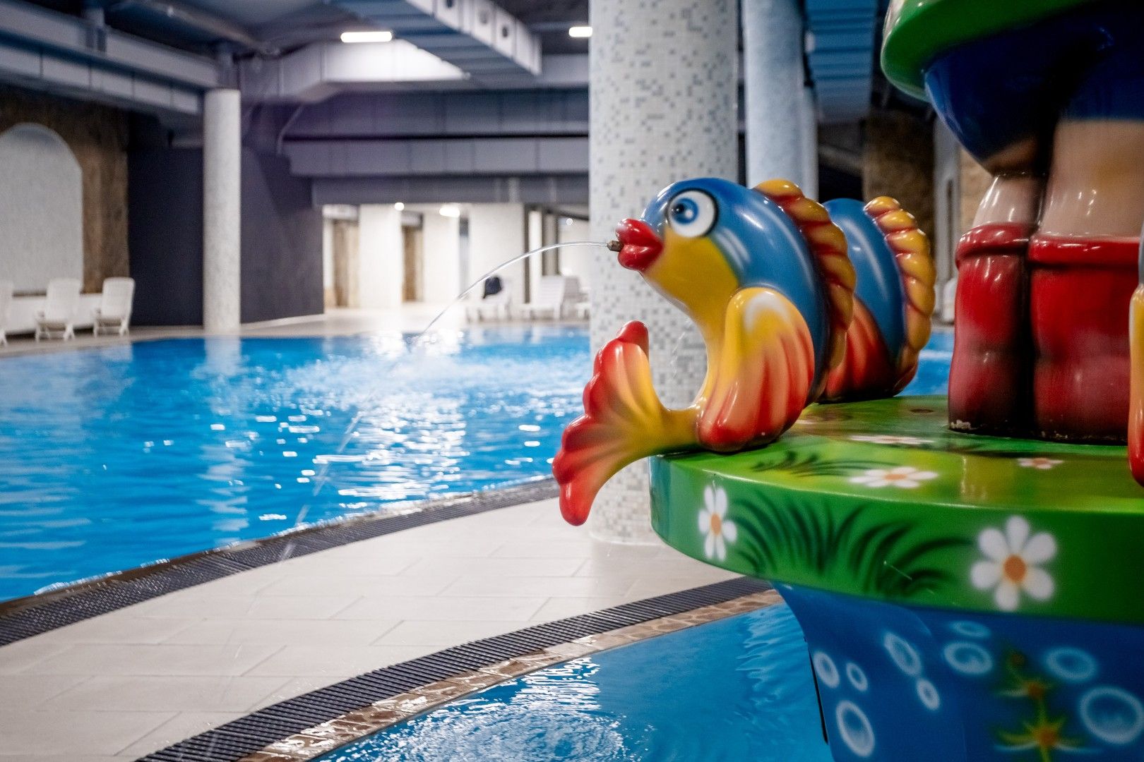 Вода подсвечивается подводными прожекторами и подогревается до комфортной температуры круглый год: +29°C подростковый и взрослый бассейны, +32°C - детский бассейн.